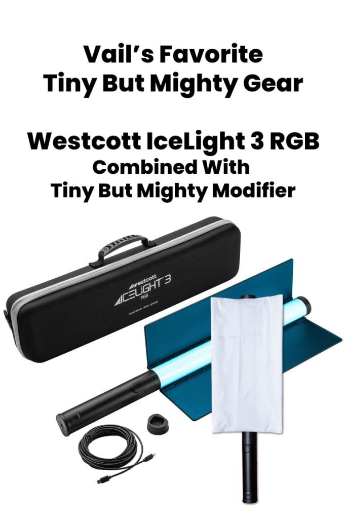 The RGB Ice Light 3 from Westcott is the piece of equipment that changed EVERYTHING for me. It is my favorite Tiny But Mighty piece of gear, other than the Tiny But Mighty Modifier. It is an all-in-one creative lighting tool. This handheld RGBWW LED delivers stunning color accuracy, vibrant hues, and pure whites with flexible AC/DC power options, barndoors for precision, and total creative control—perfect for portraits, filmmaking, and content creation. I prefer the RGBWW version over the bi-color one because it gives me so much more creative flexibility with all the different colors I can create. I designed the Tiny But Mighty Modifier specifically for using the Ice Light 3s for on-location headshots. You can see how I use them in action here at an event where I adjusted the color of the background to the subject’s preference and took editorial style headshots of them using only ice light 3s and my tiny but mighty modifier. But if you are looking to get IceLights and have a tight budget the bi-color LED Ice Light 3 delivers industry-leading color accuracy and an adjustable 2700K–6500K and is also compatible with the Tiny But Mighty Modifier.